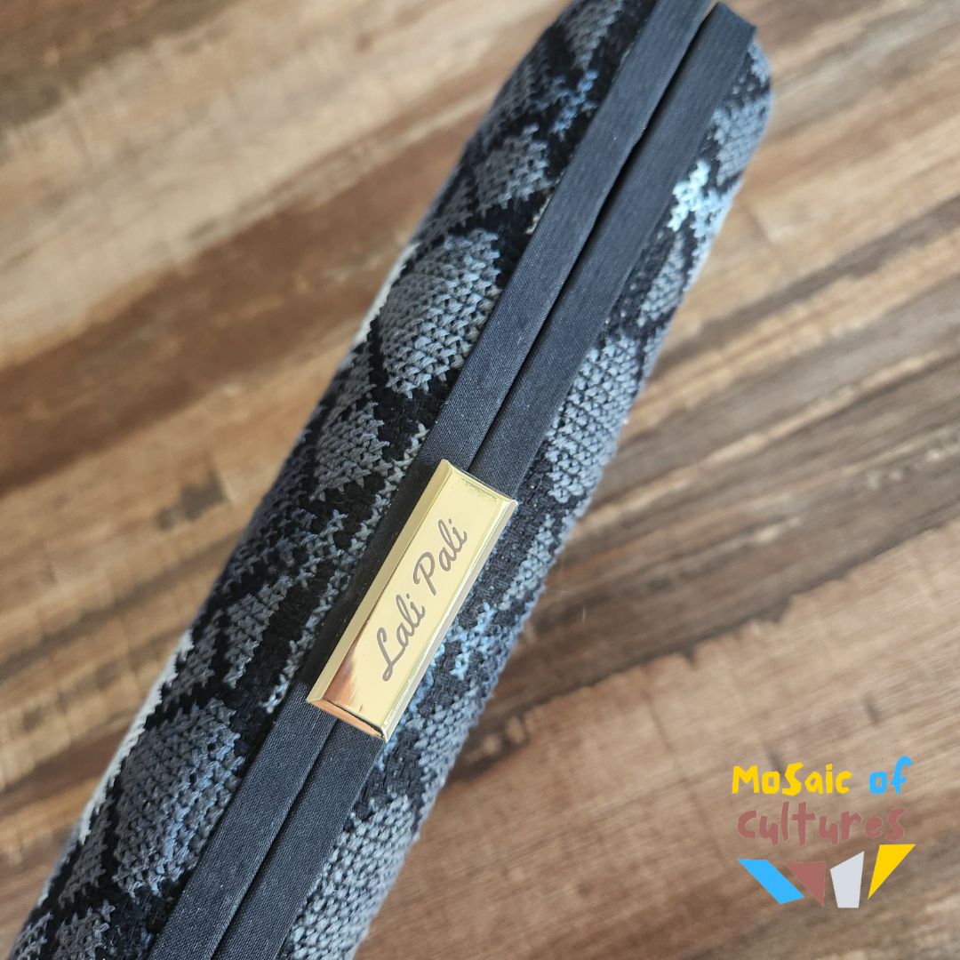 Elegance meets heritage. The Lali Pali Purse is designed, hand-stitched, and crafted in Lebanon, showcasing masterful embroidery with DMC silk threads on premium canvas. Its classic gray and black palette embodies timeless artisanal traditions.